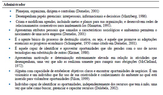 De acordo com Dornelas (2001, p. 30), "a palavra empreendedor (entrepreneur) tem origem francesa e quer dizer aquele que assume riscos e começa algo novo". Para o autor, o empreendedor de sucesso apresenta características extras daquelas observadas nos administradores, "e também alguns atributos pessoais que somados a características sociológicas e ambientais permitem o nascimento de uma nova empresa" (p. 30). O autor também afirma que "o empreendedor é um administrador, mas com diferenças consideráveis em relação aos gerentes ou executivos de organizações tradicionais, pois os empreendedores são mais visionários que os gerentes" (p. 30). De acordo com Filion (1999), a principal diferença entre o administrador e o empreendedor é o foco de cada um, enquanto o primeiro é voltado para a organização dos recursos, o segundo é voltado para a definição de contextos. Dornelas (2001) também considera que o empreendedor é um administrador completo, que interage com o ambiente no intuito de tomar as melhores decisões para o negócio.