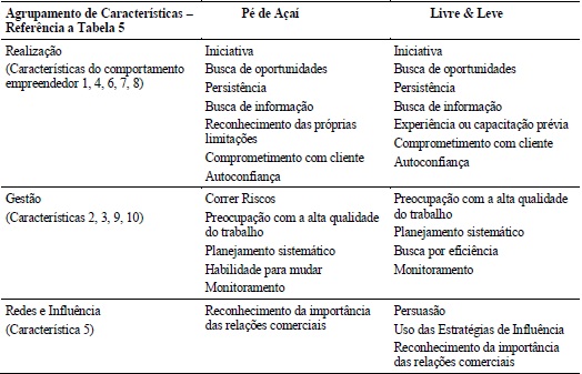 Com relação ao segundo aspecto, qual seja, análise do perfil e das características dos empreendedores da Livre & Leve e do Pé de Açaí, na Tabela 4 são apresentadas as características observadas de acordo com a classificação desenvolvida por McClelland, que foram agrupadas para facilitar a discussão em sala de aula com os alunos.
