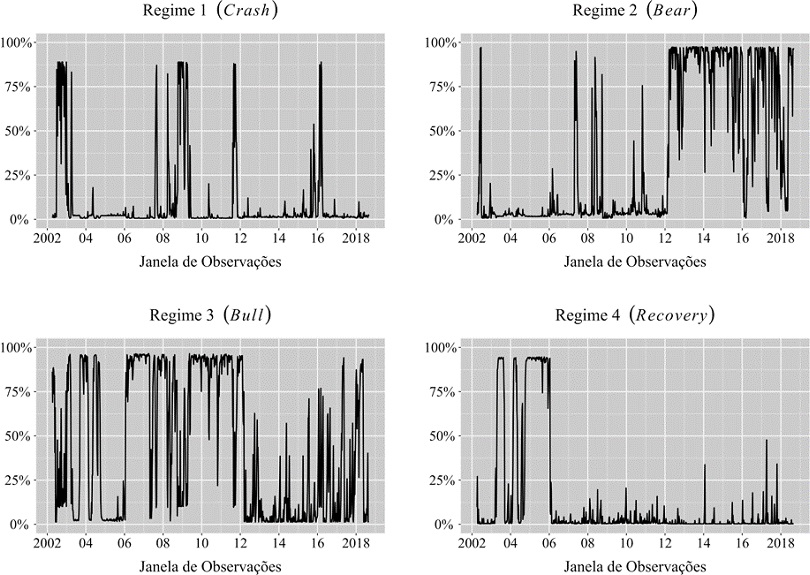 Em complemento, as probabilidades filtradas (Fig. 1) mostram que o recovery era o regime mais presente até 2006 no Brasil. Os regimes crash e bull eram mais frequentes até 2012. E após essa data, o bear market se tornou o regime mais persistente.