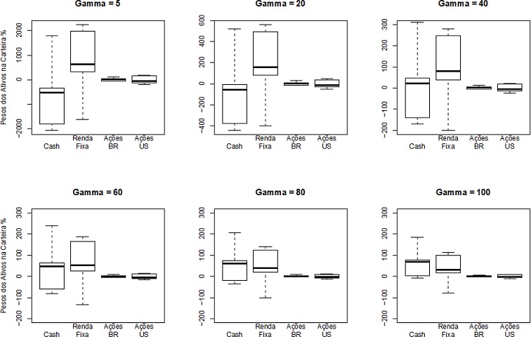 A figura ilustra a distribuição dos pesos nas carteiras formadas pelo modelo CGL alavancado, configurado para γ = 5, 20, 40, 60, 80, 100 com base na amostra de 5 de abril de 2002 até 31 de agosto de 2018. Para melhor visualização, outliers foram suprimidos da imagem e imprimimos as duas primeiras figuras em escalas maiores.