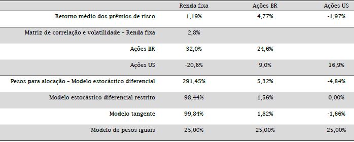 O mercado de renda variável internacional (em reais) será referenciado no modelo como ações US. Para capturar o movimento do câmbio e da renda variável internacional, calculamos a classe de ações US como o retorno do S&P 500 em dólares juntamente com o retorno da taxa USD/BRL (dada pela taxa PTAX). A tabela 1 mostra o retorno e a volatilidade destes índices. Consideramos, também, que ao invés do investidor operar diretamente no exterior, há outros veículos mais simples que permitem o acesso às ações US: Exchange Traded Funds (ETF) e fundos multimercados nacionais que concentram seus investimentos no exterior. Infelizmente, os ETFs estão restritos aos investidores qualificados. Porém os fundos multimercados estão acessíveis aos investidores comuns em plataformas amplamente divulgadas no mercado.