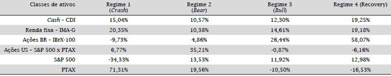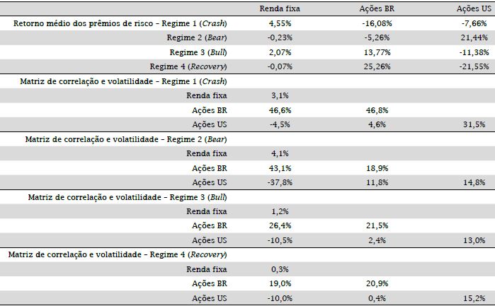 A característica do regime crash é o contraste entre o prêmio de risco fortemente negativo das ações BR e o mais alto prêmio de risco da renda fixa, enquanto as ações US estão apenas moderadamente negativas, o que se explica pela alta do dólar em períodos de crises no Brasil. Neste regime, todas as volatilidades são altas. O bear market se caracteriza por prêmios de risco moderadamente negativos nas ações BR e na renda fixa, e bastante positivo nas ações US. Já no bull market, as ações BR alcançam o terreno positivo. O prêmio de risco da renda fixa também é positivo, ao mesmo tempo em que as ações US voltam a ficar negativas. Aqui, as volatilidades são relativamente baixas. Por último, o recovery é o regime mais otimista para as ações BR, enquanto o prêmio de risco das ações US é fortemente negativo e a renda fixa praticamente zera sua performance com volatilidade bem baixa. As correlações apresentam tendências similares. Exceto por uma mudança de padrão no bear market, elas são mais fortes no crash e perdem intensidade nos regimes mais otimistas.