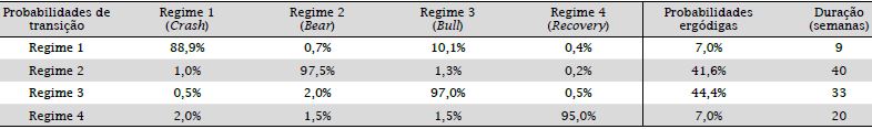 As probabilidades de transição, apresentadas na tabela 4, mostram que o regime crash é quase sempre seguido do bull market, permanecendo em média por 9 semanas. O bear market é o regime mais persistente, com duração de 40 semanas, e é possivelmente seguido pelos regimes crash ou bull market. O recovery, estado mais otimista, pode ser seguido por qualquer outro regime, mas, infelizmente, crash é o mais provável. A tabela 4 também mostra as probabilidades ergódigas (expectativa de longo prazo para o regime e/ou quando não se possui informações): os regimes extremos crash e recovery representam apenas 14% dos estados da economia, enquanto bear e bull markets representam cerca de 86% das observações.