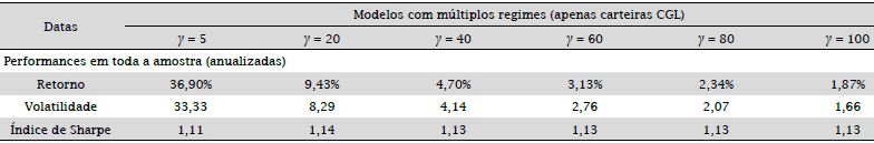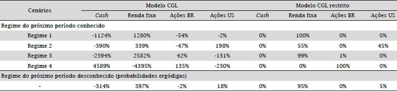 A tabela 6 reporta as estratégias dinâmicas com quatro regimes propostas por este artigo. São elas as soluções a partir do modelo CGL com vendas a descoberto e sem vendas a descoberto. Como as estratégias variam de acordo com as probabilidades de estar em cada regime, a apresentação foi ilustrada em dois cenários. No primeiro, o ‘regime do próximo período conhecido’ representa as probabilidades filtradas indicando 100% de chance de ocorrer algum regime específico (outras referências de probabilidades foram suprimidas para viabilizar a apresentação tabulada). No segundo, o ‘regime do próximo período desconhecido’ denota o cenário onde o investidor admite estar em uma economia de múltiplos regimes, mas ele não tem acesso às probabilidades filtradas para inferir os regimes, e então utiliza a configuração mais conservadora, que são as probabilidades de longo prazo (ergódigas).