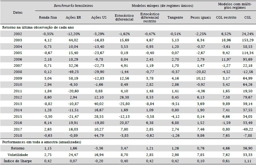 Para efeito de comparação, a tabela 7 mostra as performances anualizadas das classes de ativos utilizados como benchmarks brasileiros, das estratégias míopes (que enxergam um único regime) e das carteiras sugeridas pelo modelo CGL com múltiplos regimes (com e sem venda a descoberto). Conforme vimos na seção anterior, desde o início das observações até 2012, os regimes mais frequentes eram crash, bull e recovery - aqui, observamos as devidas consequências. Em 2003 e 2009, os prêmios de risco da renda fixa ficaram ligeiramente acima de 3%. Já 2003, 2007 e 2009, mostram que os maiores resultados de ações BR ficaram pouco acima de 30%. E entre 2002 e 2010, as ações US ficaram negativas. Observamos também que o modelo estocástico diferencial e o modelo tangente têm resultados muito próximos à classe de renda fixa. Ao mesmo tempo, em 6 destes 10 anos de carteiras mais alavancadas, através do modelo CGL, o investidor poderia ter obtido prêmios de risco acima de 50% ao ano - sendo 2003, 2005 e 2006 acima de 95%. Apenas em 2007 e durante a crise do subprime, o modelo não apresentou performance acima do mercado.