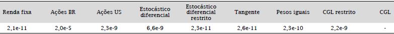 Para analisarmos a significância dos retornos obtidos pela carteira CGL, aplicamos o teste de Wilcox sobre as séries de retornos semanais na amostra completa. Este teste compara a média dos retornos da carteira CGL com a média dos retornos de cada um dos investimentos analisados - classes de ativos e demais carteiras. A tabela 8 apresenta os p-valores para o teste unicaudal, cuja hipótese nula é que a média dos retornos da carteira CGL não seria maior que dos benchmarks. Note-se que todos os testes apresentaram significância estatística a menos de 1%, indicando que a carteira CGL apresentou melhores retornos com robustez. Portanto, os resultados levam à conclusão de que a média do retorno semanal da carteira CGL é estatisticamente superior às outras médias.