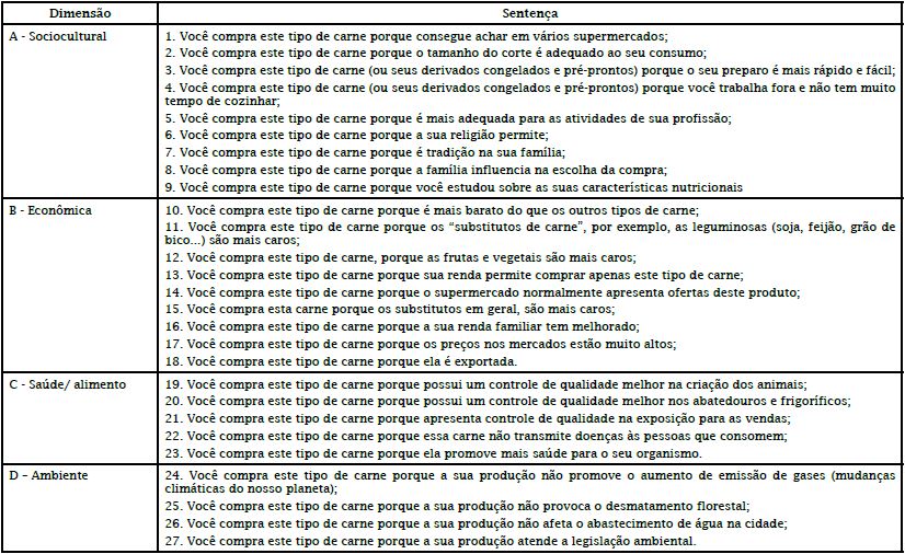As dimensões analisadas no Survey basearam-se no modelo conceitual de Brandão et al. (2015), sociocultural, econômica, saúde/alimento e ambiente, extrapolando as observações para os consumidores de carnes bovina, suína e aves.