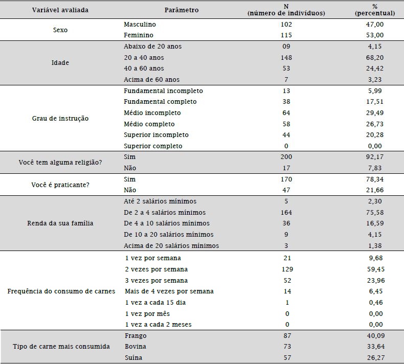 Os resultados (Tabela 1) revelaram que não houve discrepância com relação ao sexo e a idade da maioria dos entrevistados, que ficou entre 20 a 40 anos de idade. Com relação ao grau de instrução, houve uma homogeneidade nos percentuais dos entrevistados que possuem ensino médio completo, médio incompleto e superior incompleto, perfazendo um total de 76,50% da amostra total. Entretanto, não foram entrevistadas pessoas com nível superior completo. A maioria dos entrevistados seguia alguma religião, entretanto apenas 78,34% destes confirmaram que eram praticantes. A renda da maioria dos entrevistados situou-se entre 2 e 4 salários mínimos. Com relação a frequência do consumo de carne, a maioria dos entrevistados indicou consumir carne duas vezes por semana. De modo geral, os consumidores preferiram, em ordem decrescente de consumo, carne de frango, bovina e suína.
