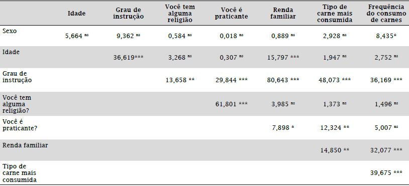 Segundo a Tabela 2, a variável Idade relacionou-se positivamente com o Grau de Instrução e com a Renda Familiar. Demonstrando que os entrevistados mais velhos apresentam maior grau de instrução e renda familiar. Houve ainda relação positiva entre Grau de Instrução e Você é Praticante, Renda Familiar, Tipo de Carne Mais Consumida e Frequência do Consumo de Carnes. Dessa forma, comprovou-se haver uma relação positiva e significativa entre o grau de instrução dos entrevistados que estavam concluindo ou que concluíram o ensino médio e superior, com uma maior renda familiar, uma maior distinção na escolha do tipo de carne e maior frequência de consumo de carne.