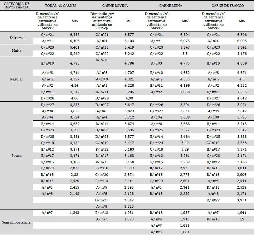 Os resultados da análise Mean Item Score (MIS), dos diversos tipos de carne, obtidos por meio das respostas dos consumidores no Survey, encontram-se descritos na Tabela 3 que categoriza as respostas das questões do questionário nos quesitos: alta importância; média importância, baixa importância e sem importância.