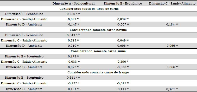 Houve correlações positivas elevadas e significativas (Tabela 4) entre as dimensões A - Sociocultural e B - Econômica, para a variável todos os tipos de carne, para a carne bovina e para carne de frango. Isso indica uma forte associação entre preço do produto com as questões socioculturais. Essa correlação significativa pode ser associada aos hábitos de vida contemporânea da população economicamente ativa, cujas atividades profissionais determinam um tempo menor para a preparação de refeições (Oliveira, Ferreira, Santana, Santos, Brito, & Mendes, 2015; Oliveira et al., 2017). Apesar desta associação não ter sido significativa para carne suína, atribui-se ao fato de ser a carne menos consumida entre os entrevistados (Tabela 1).