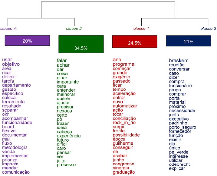 A classe 1 representa 24,5% dos segmentos de texto e, na sua análise, fica claro que o conceito central é o programa de aceleração promovido pelas grandes empresas, e a proximidade de contexto com a classe 3 é evidente. Algumas palavras presentes nessa classe indicam que os programas de aceleração são temporais, ou seja, têm um início, meio e fim. Contudo, observou-se nas entrevistas que mesmo após o término formal do programa de aceleração, as startups continuaram mantendo contato com as grandes empresas e tendo acesso aos mentores. Percebe-se também na classe 1 a presença de verbos que indicam as novas possibilidades que surgiram para as startups inseridas nos programas, desde a mudança expressiva na gestão e desempenho organizacional até a abertura de mercado para novos clientes, fatos também observados nos dashboards de gerenciamento de projetos e tarefas das startups.