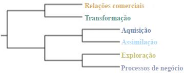 No mesmo nível da primeira aglomeração surge o agrupamento Exploração e Processos de negócio. Porém, antes da interpretação dessa descoberta, faz-se necessário observar o último e mais distante agrupamento: Relações comerciais e Transformação. Sabe-se que além da busca por conhecimento, as startups veem nos programas de aceleração corporativa uma oportunidade para iniciar e manter relações comerciais com as grandes empresas. Nesse contexto, a capacidade das startups em combinar os conhecimentos existentes com os conhecimentos adquiridos da grande empresa sustenta a parceria comercial entre as duas organizações. O agrupamento Relações comerciais e Transformação, que se apresenta mais afastado dos demais, porém ligado a toda a aglomeração, distingue-se dos outros por apresentar uma forte representatividade para as startups. Retornando ao agrupamento Exploração e Processos de negócio, o conhecimento transformado é utilizado pelas startups para melhorar seu desempenho organizacional. É nesse estágio que os processos de negócio são estruturados nas startups, em que se criam rotinas, procedimentos e controle para as atividades críticas. De fato, a pesquisa evidenciou que as capacidades de transformação e exploração, decorrentes da capacidade de absorção realizada, são susceptíveis de influenciar o desempenho das startups por meio da inovação de processos e organizacional.