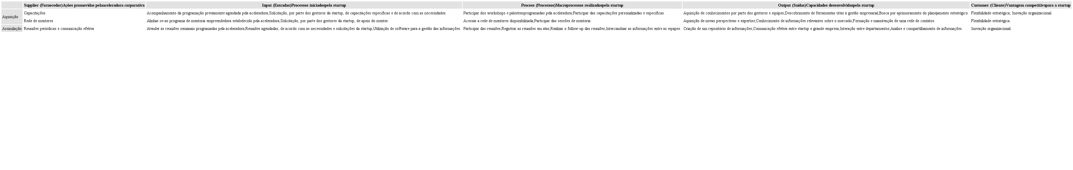 Segundo a ABPMP (2013), o modelo SIPOC pode ser aplicado em situações em que seja necessário obter um consenso sobre quais aspectos de um processo devem ser estudados. O uso dessa técnica permitiu que os processos de negócio que constituem a capacidade de absorção das startups fossem identificados e arranjados de forma simplificada em uma tabela, facilitando a visualização das entradas e saídas dos processos.