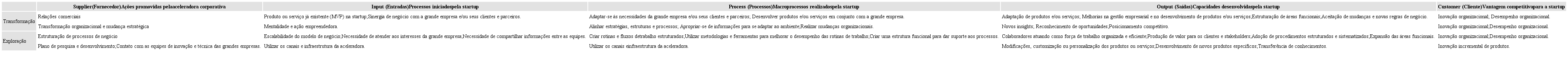 A ênfase principal da dimensão de exploração está nas rotinas que proporcionam às empresas explorar o conhecimento, fornecendo mecanismos estruturais, sistêmicos e processuais que permitem às empresas sustentar a exploração desse conhecimento por longos períodos (Zahra & George, 2002). Verificou-se nesta pesquisa que a escalabilidade do modelo de negócio das startups, juntamente com a necessidade de atender aos interesses da grande empresa, levou as startups a estruturarem seus processos, desenvolvendo um conjunto profissional, disciplinado e repetível de práticas sobre processos de negócio. Para Zahra e George (2002), os resultados das rotinas de exploração sistemática é a criação persistente de novos bens, sistemas, processos, conhecimento ou novas formas organizacionais. Nesse contexto, observou-se o desenvolvimento de novos produtos e/ou serviços nas startups, mesmo que de forma modesta e incremental.