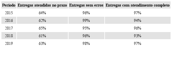 A equipe de logística identificou que, em 2019, a grande maioria das entregas era realizada atendendo as especificações do cliente, ou seja, sem erros e completas. No entanto, apenas 63% das entregas planejadas foram realizadas sem atrasos ou cancelamentos. Esse indicador foi considerado como deficitário pela Diretoria de Logística, que esperava um valor de pelo menos 90% para as entregas realizadas no prazo. Portanto, melhorar o nível de serviços se tornou prioritário.