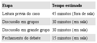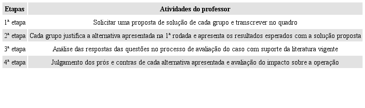 Este caso de ensino incentiva o debate de potenciais soluções para um caso real, sendo, portanto, uma ferramenta pedagógica na formação de novos gestores. Além dos cenários disponibilizados no caso, estudantes de cursos de gestão também podem ser estimulados a ir além de soluções já estabelecidas na literatura, propondo soluções inovadoras. Para tanto, é fundamental o papel do professor como moderador e motivador das equipes de trabalho. Sugere-se que o professor adeque o caso à realidade encontrada em sala de aula, aplicando-o em um conjunto de etapas. O caso prevê uma duração aproximada de duas horas para completa aplicação (Tabela 4).