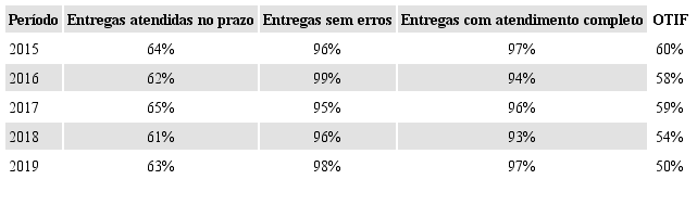 Essa complexidade operacional resultava em desafios para a distribuição. Através de uma análise de alguns indicadores de desempenho, Pedro pôde identificar que o atendimento dos prazos acordados (on time) tinha forte impacto no nível de serviços (Tabela 1).