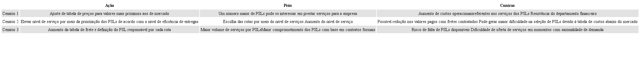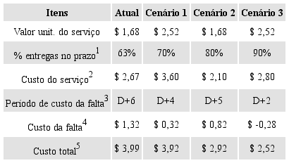 Cenário 2: A priorização dos PSLs mais eficientes pode contribuir com a efetividade nas entregas dentro do prazo e, portanto, contribuir com os indicadores de nível de serviço. Estima-se que esta priorização eleve o percentual das entregas no prazo para 80%, reduza os custos do serviço e o custo da falta de produtos em relação ao cenário atual. Porém, sem o reajuste na tabela de fretes há uma preocupação com a contratação dos PSLs, uma vez que pode elevar o tempo para a seleção do prestador de serviços e consequentemente elevar os custos de falta de fornecedor.