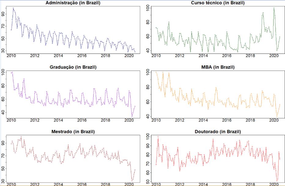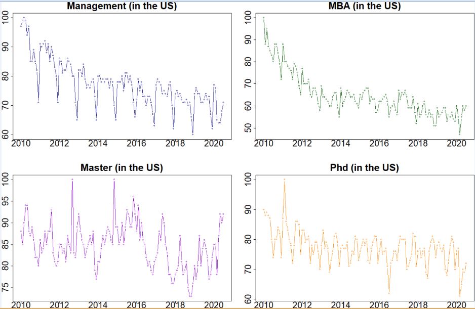 For marketing research, one source of relevant information is Google Trends. For example, researchers can use this type of data to improve the ‘nowcasting’ of the market’s demand for goods or services (Carrière-Swallow & Labbé, 2013). To illustrate, I am searching for the words ‘Administração,’ ‘Curso técnico,’ ‘Graduação,’ ‘MBA,’ ‘Mestrado,’ and ‘Doutorado’ in Brazil for the period 2010-2020 (Fig. 2), and for the words ‘Management,’ ‘MBA,’ ‘Master,’ and ‘PhD’ in the United States (Fig. 3). Although a more profound discussion of the topic is out of the scope of this document, it seems that the demand for ‘Administração’ and ‘MBA’ is decreasing since 2010 in Brazil. On the other hand, ‘Curso técnico’ appears to be a more searched option for Brazilians in the last few years. The search for ‘Management’ and ‘MBA’ also seems to be decreasing since 2010. We observe similar trends in the searches for related terms in the United States, showing an apparent decrease in the public interest for these courses in this country. Also, notice the seasonality of these series, suggesting the data is fruitful to tutorial-articles dealing with this topic.