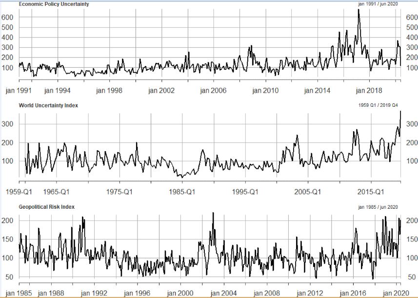 Another example of a useful dataset can be found in Baker, Bloom and Davis (2016): the Economic Policy Uncertainty. The data is described at https://www.policyuncertainty.com/ (retrieved in August 10th, 2020) and is available for several countries, including Brazil. In Figure 4, I show three graphs with data from this dataset: the Economic Policy Uncertainty index, the World Uncertainty index, and the Geopolitical Risk index. These indexes are measured using newspapers, counting words related to uncertainty and risk. Though a more detailed investigation is out of the scope of this document, it seems that COVID-19 rose the uncertainty across the globe since March 2020.