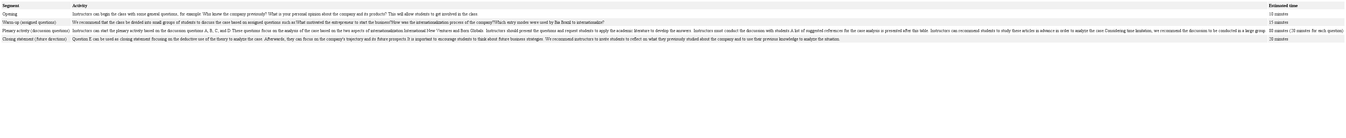We recommend instructors to make the case available for students to read in advance. Considering the previous reading, we present a plan to conduct the class with four segments. The activities and estimated time of each segment are presented in Table 1.