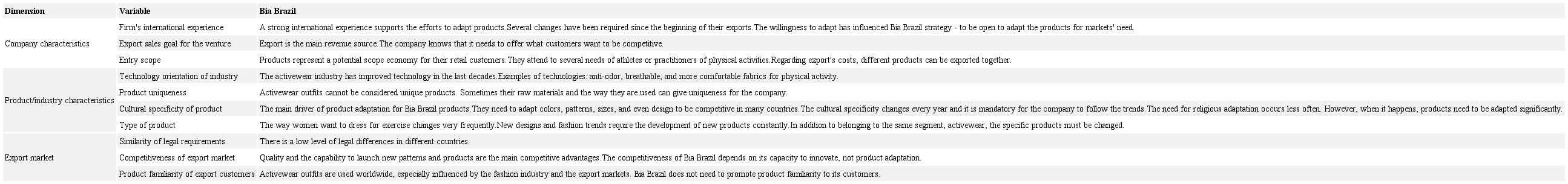 This teaching case presents the company Bia Brazil, one of the leading Brazilian exporters of activewear, founded in 1994 by a former gymnast, Beatriz, with websites in Portuguese, English, and Spanish. In 1996, the first exports to Costa Rica took place. Over the years, the company has expanded its sales to over 40 countries. The company seeks the constant offer of new products that meet the requirements and demands of each country. Despite its international growth, the company’s presence in the Brazilian market remains small. There have been two failed attempts at physical stores, and although it continues with only online sales in the domestic market, the entrepreneur seeks a model to grow inside Brazil. We recommend the use of the case in courses related to internationalization, more specifically to International New Ventures and Born Globals. Some connections with other classes can be made and are recommended with the case analysis.