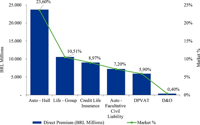 The Brazilian insurance market is concentrated over a few lines of business. In 2017, 53% of the 100.56 billion BRL in direct premiums issued by insurance companies were originated from the five largest lines: Auto - Hull, Life - Group, Credit Life Insurance, Auto - Facultative Civil Liability, and DPVAT (a compulsory insurance for personal injury caused by motor vehicles). The remainder direct premiums issued in 2017 were distributed throughout the other 122 lines of insurance regulated by Susep. During this period, premiums underwritten of D&O insurance were 405 million BRL, representing 0.4% of the entire market’s revenues. Figure 1 shows the market share of the premiums issued in 2017.