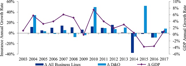 In 2015, the annual growth of the D&O line was the highest in the historical series, both in absolute terms and in relation to the whole insurance market. Such development turns out to be even more unique due to its occurrence in a context of economic recession, signaled by the annual drop in GDP of -3.77%. The connection between D&O insurance and the Federal Police’s investigation is not unprecedented. Fernandes and Guerra (2018) consider the operation to be a true watershed for the insurance market, causing insurers to be more cautious about underwriting the risk of their policyholders.