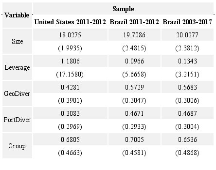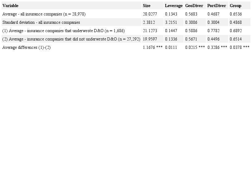 Over the period analyzed, 28,978 observations were obtained, and in 1,686 of those there was D&O insurance underwriting. The average difference between the insurers that underwrote D&O and those that did not is statistically significant at 1% for almost all the characteristics considered. On average, the insurance companies that underwrite D&O are larger, more likely to belong to an economic group, and have greater geographical and portfolio diversification. These results are similar to those obtained by Fier and Liebenberg (2014), corroborating the hypothesis that insurance companies that are larger on market share, with a more diversified portfolio and with a broader geographical reach, are more likely to supply specific products and/or with greater complexity.