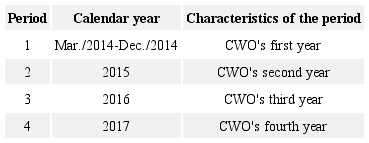 To correct the effect of inflation on the monetary values of the data over time, it was used the monthly historical series of the IPCA, Índice Nacional de Preços ao Consumidor Amplo (Extended National Consumer Price Index), obtained from the database of Ipeadata, Instituto de Pesquisa Econômica Aplicada (Institute of Applied Economic Research), both official of the Brazilian government. Monetary data was brought to the present value to the last observed period (Dec./2017). Data on the CWO phases were obtained in the area of publications to the press from the Brazilian Federal Police website. Between Mar./2014 and Dec./2017, 47 phases were observed in 32 months.