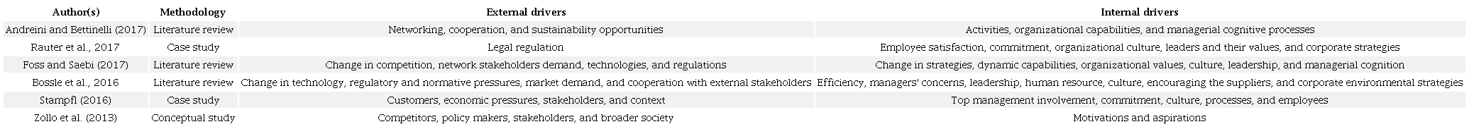 Whereas customers and economic pressures are regarded as the most important external drivers constituting change in BMs (Stampfl, 2016), Rauter, Jonker and Baumgartner (2017) conclude that customer preference and competition do not trigger change in BMs toward sustainability. Additionally, policy-makers and legal regulations can contribute to transformation in BMs (Bossle et al., 2016; Foss & Saebi, 2017; Rauter et al., 2017; Zollo et al., 2013). Researchers also claim that competitors, cooperation within the network on one hand, and change in competition, stakeholders, and market demand on the other hand (Andreini & Bettinelli, 2017; Bossle et al., 2016; Foss & Saebi, 2017; Stampfl, 2016; Zollo et al., 2013), are relevant external drivers. Finally, change in technologies is mentioned as being the antecedent to eco-innovations and BMIs (Bossle et al., 2016; Foss & Saebi, 2017). In Table 1, the findings from the most recent literature are summarized in terms of internal and external drivers underlying the transformation in BMs as well as the papers’ methodology.