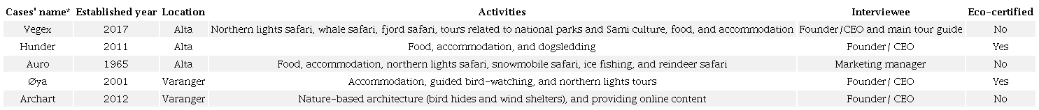 To identify cases and come to grips with the context, pre-fieldwork meetings were arranged with local researchers (from UiT/The Arctic University of Norway), and the organizations Kunnskapsparken Origo (knowledge park) and Innovasjon Norge (Innovation Norway). These two organizations are responsible for supporting companies by offering consultancy and funding at different stages of BM development. Simultaneously, the online content underlying the tourism sector in the area was explored to gain an overview of the existing tourism companies and their online profile, as well as promotional materials.