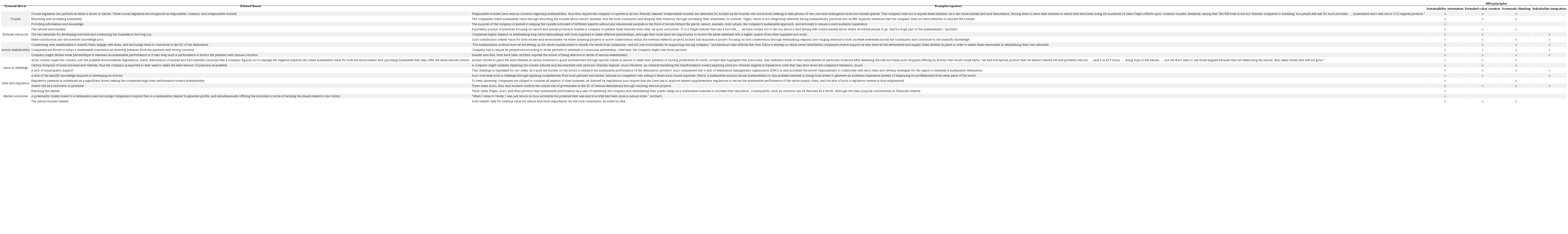 Moreover, six external drivers are distilled, ‘tourist,’ ‘external resources,’ ‘actors-stakeholders,’ ‘challenges and issues,’ ‘state and regulation,’ and ‘market incentives.’ Three themes are realized through data analysis in relation to the tourist’s impact as a driver. The most important emerging theme is tourist segments a company serves. Throughout the current research, the tourist segment with a positive effect (driver) is labeled as responsible tourist. Indeed, attracting them may perform in two ways: increasing tourist satisfaction and strengthening the sustainable performance. However, the companies refer to the tourists’ demands for particular activities that are understood as unsustainable and not eco-friendly, thus, a barrier toward performing sustainable. This type can be either a common tourist or irresponsible tourist; a common tourist is referred to by the cases as a tourist without any specific concern toward nature and sustainability, while an irresponsible tourist may try to deliberately destroy the attraction and nature. Besides, a common tourist neither is responsible nor destroys the nature deliberately; they may make the companies offering activities known as less eco-friendly. Therefore, ‘tourist’ can be regarded as a double-edged sword; Archart claims that “you need to decide what kind of tourism you want.”