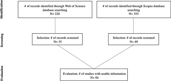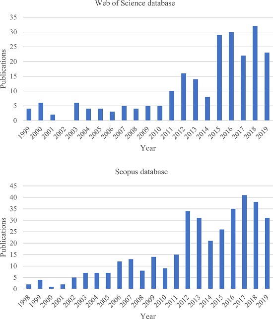 Considering the frequency of publications, results, and evidence brought from the selected articles, and contradicting Elkington’s observation about his own concept, TBL has not been losing credibility along the years, considering the overwhelming acceptance of the TBL with an increase of publications from 2015 to 2019 in both databases (Figure 3). This evaluation was made considering the first phase of data identification. It is set to consider all articles in the area of operations management and sustainability that mention the TBL, even if it is not a central point to the discussion. The following qualitative overview relies on the 84 articles selected after the screening process.