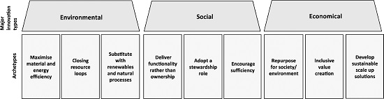 To account for the triple bottom line in the manufacturing sector, we investigated the literature to understand different classifications of sustainable business models. We used the archetypes originally developed by Bocken et al. (2014), who used them to “describe groupings of mechanisms and solutions that may contribute to building up the business model for sustainability” (Bocken et al., 2014, p. 45). These archetypes were updated in 2016 as seen in Figure 1 to include a broader scope (Bocken, Weissbrod, & Tennant, 2016) (see Appendix for complete framework). They broke down the broad nature of approaches in sustainable business modeling into a substantial framework.