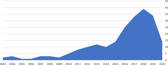 In total, we downloaded 561 results. We uploaded these results into Rayyan (available at https://rayyan.qcri.org/ retrieved in April 30, 2020). The samples, after cleaning, were screened for relevance by reading the titles, abstracts, and keywords. Inclusion criteria are articles based on empirical research, articles using primary data. The initial sample highlights some interesting information. As depicted in Figure 2, the number of publications investigating sustainable business models in manufacturing has increased remarkably in the past five years. Only two documents were published in this area in 2002 compared to 40 in 2018. So far as of April 2020, 14 documents had been published before the middle of the year, thus, implying that major developments have been going on in research and practitioners within the manufacturing sector are utilizing sustainable business models.