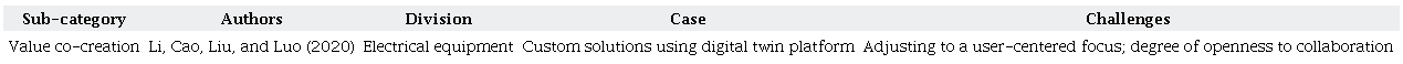 Bocken, Weissbrod, et al. (2016) added inclusive value creation to the archetypes to encompass value creation for a broader base. These are business models based around resource sharing as well as knowledge, ownership, and wealth creation. Li et al. (2020) investigated how co-creation can deliver sustainable value through a digital twin platform network. Such a platform can provide a comprehensive overview of products, manufacturing processes, supply chain, customer experience, and profitability. In the case study, this enabled the manufacturer to provide smart solutions based on specific customer needs. The challenge here involves a difficulty in adjusting from an enterprise-focused strategy to a user-focused strategy.