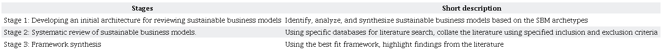 The study aims to contribute to the ongoing debate about the impact of industry on the future of our planet and society. We structured the paper as follows: Stage 1 presents a descriptive outline of the literature on sustainable business models and its dimensions. In Stage 2, the scope of the review, research design and synthesis approach are explained. Stage 3 presents the synthesis and findings of sustainable business models in the literature. Finally, we draw conclusions and highlight implications and avenues for future research.