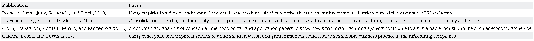 At the time of writing, a range of reviews related to our research area has been published. However, they review sustainable business models in manufacturing from a different focus. The reviews and their focus are summarized in Table 2.