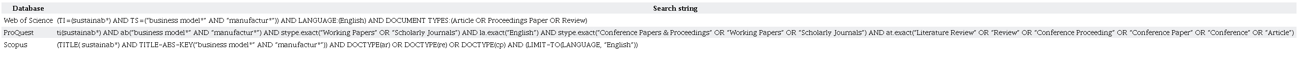 To search adequately and ensure traceability, we used relevant keywords associated with the scope of the article and our research questions. We choose these keywords to capture relevant papers dealing with business models while accounting for sustainability. We enabled wildcards to avoid issues regarding variants and plural forms, and search results were limited to papers published in English. The string (as shown in Table 3) was adapted for each database as the search mechanisms behind them are slightly different. The search was last conducted in April 2020.
