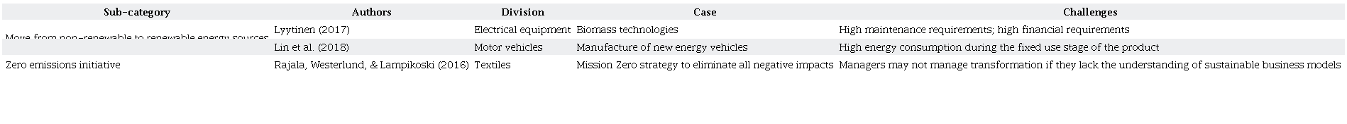 While improving resource efficiency and creating value from waste focus on reducing environmental impacts, Bocken et al. (2014) argue that these do not consider the potential benefits from renewable resources and natural processes where environmentally sustainable value is created in a more significant manner. Lyytinen (2017) explored sustainable business models of small-scale bioenergy solutions in high- and low-income contexts. In the high-income context, wood chips were utilized in a fully automated solution targeted to wealthy customers while in the low-income context, organic waste were utilized in a low-cost solution targeted to the poor. The findings indicated that promoting sustainability in different parts of the world requires radically different design and manufacturing approaches. However, the solutions required high financial requirements with the low-income context requiring high level of maintenance. Lin et al. (2018) analyzed sustainable business models in the new energy vehicles through a single case study of a car manufacturer in China. In this case, the case company uses this approach to target a combination of mass market and the public sector. They noted that a large impact of this application of renewable energy was large energy consumption during the use stage of the vehicle. These challenges from both studies correlate with Bocken et al. (2014), who stated that moving from non-renewables to renewables is not yet economically viable or cannot be made efficiently at volume. Nonetheless, progress is being made.