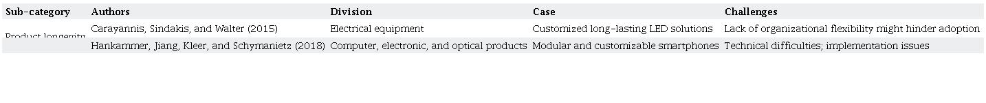 Carayannis et al. (2015) and Hankammer et al. (2018) discuss encouraging sufficiency. Products and services under this archetype aim to reduce production by the manufacturers and consumption by customers/end-users (Bocken et al., 2014). The articles deal with product longevity and contribute to the discourse about the effects of overconsumption and overproduction of electrical and electronic goods. In the case presented by Hankammer et al. (2018), mass customization of smartphones was presented to improve product longevity in the smartphone market. Their findings indicated the social value of such a solution being high especially when specific features required by the user could be integrated. They claim that case product failed due to reasons including economic, organizational, and technical difficulties. In the case presented by Carayannis et al. (2015), the company was a success due to an overhaul of the business model at an organizational level. The case company, being the first to introduce LED lighting into Thailand, found itself able to compete at the level of quality by switching to producing customized lighting solutions that lasted longer than the competition.