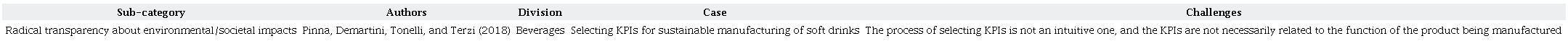 Bocken et al. (2014) selected adopting a stewardship role because it “maximizes the positive societal and environmental impacts of the firm by ensuring long-term health and well-being of all stakeholders.” (Bocken et al., 2014, p. 51) In Pinna et al. (2018), sustainability KPIs were collected to show how soft drink manufacturers can maximize positive impacts along four sections: materials and packaging, water and energy, emissions, and other general aspects. Here, critical issues soft drink companies focus on are mainly connected to material reduction and recycling, or resources conservation. Challenges occur in applying sustainability KPIs in practice, as it is not an intuitive process along the whole supply chain.