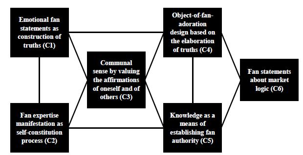 It was possible concluding that indie music fans perform a stance alethurgy in their interactions about this musical universe. The communal sense (C3) is at the heart of this process, since it establishes and legitimizes individuals’ behaviors. On the one hand, the community endorses the way fans relate to the genre and to their favorite artists, whether through emotional statements (C1) or through expertise manifestations (C2). On the other hand, it establishes the fan condition associated with the ability of fandom members to outline their object of adoration (C4), to establish a fan authority (C5) and, then, to take a stance toward the market logic (C6) the genre is inserted in. This dynamics reveals how alethurgy happens in the herein investigated empirical field (see representation in Figure 2).