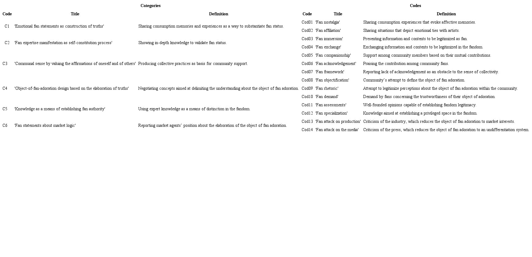 The theoretical and conceptual backgrounds adopted in the current research assumed a double function: firstly, they supported the construction of the research problem and worked as guidelines for data observation and analysis; secondly, they were used as resource to support the elaboration of the inferred codes and categories, with regard to their descriptions. Thus, elicited codes associated with the empirical context of the current investigation were subjected to the interdisciplinary approach comprising CCT and Fan Studies in order to advance in relation to the initial literature review, based on data interpretations. Grouping these codes into categories has led these interpretations to a broader abstraction level directly aligned with the herein proposed problem, based on Foucault’s theory. Based on this line of reasoning, category titles aimed at expressing alethurgical acts, whereas code titles indicated the most immediate fan practices supporting them.