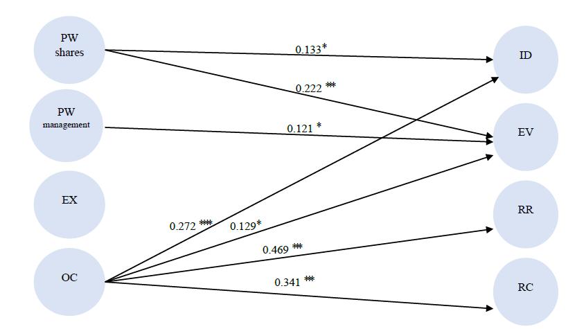 The F-PEC construct had a Cronbach alpha of 0.94. We followed the study of Jaskiewiecz, González, Menéndez, and Schiereck (2005) - specifically, our study analyzes only the proportion of shares held by the family (PW01) and the proportion of family members on the board of directors (PW02), since Brazilian companies are not obliged to formalize their corporate governance. The total variance explained resulted in 48.5%, which indicates reliability as told by Hair, Black, Babin, Anderson, and Tatham (2009). The KMO test showed an index of 0.90 and Bartlett’s test of sphericity showed statistical significance (p < 0.05).