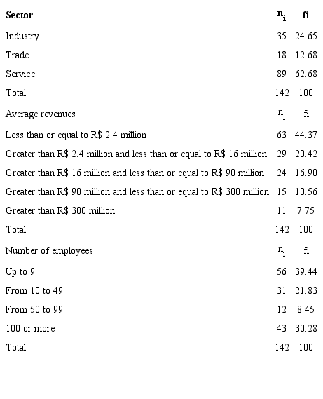 According to the data, around 91% of the respondents occupy the position of CEO, director, or president; the remaining 9% occupy other functions that also have decision-making responsibilities. In average, they have been in the company for nine years and have roughly five years of experience in the function. Most of the respondents of this research are male (89%), between 41 and 50 years of age (35%); 25% of the respondents declared to be post-graduated (master/PhD); and 50% have specialization (MBA). It is worth noting that they are mostly educated in the field of Administration (44.37%), followed by Engineering (21.83%), Information Technology (9.86%), and finally Accounting Sciences (4.93%).