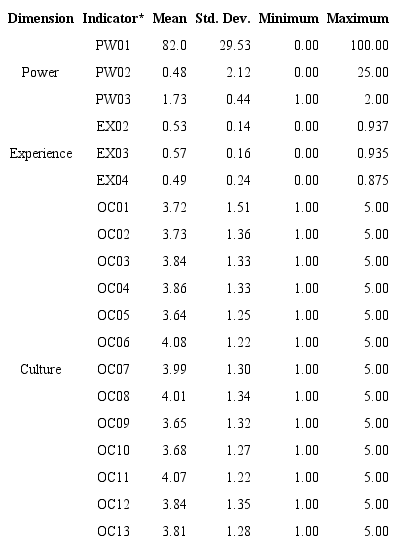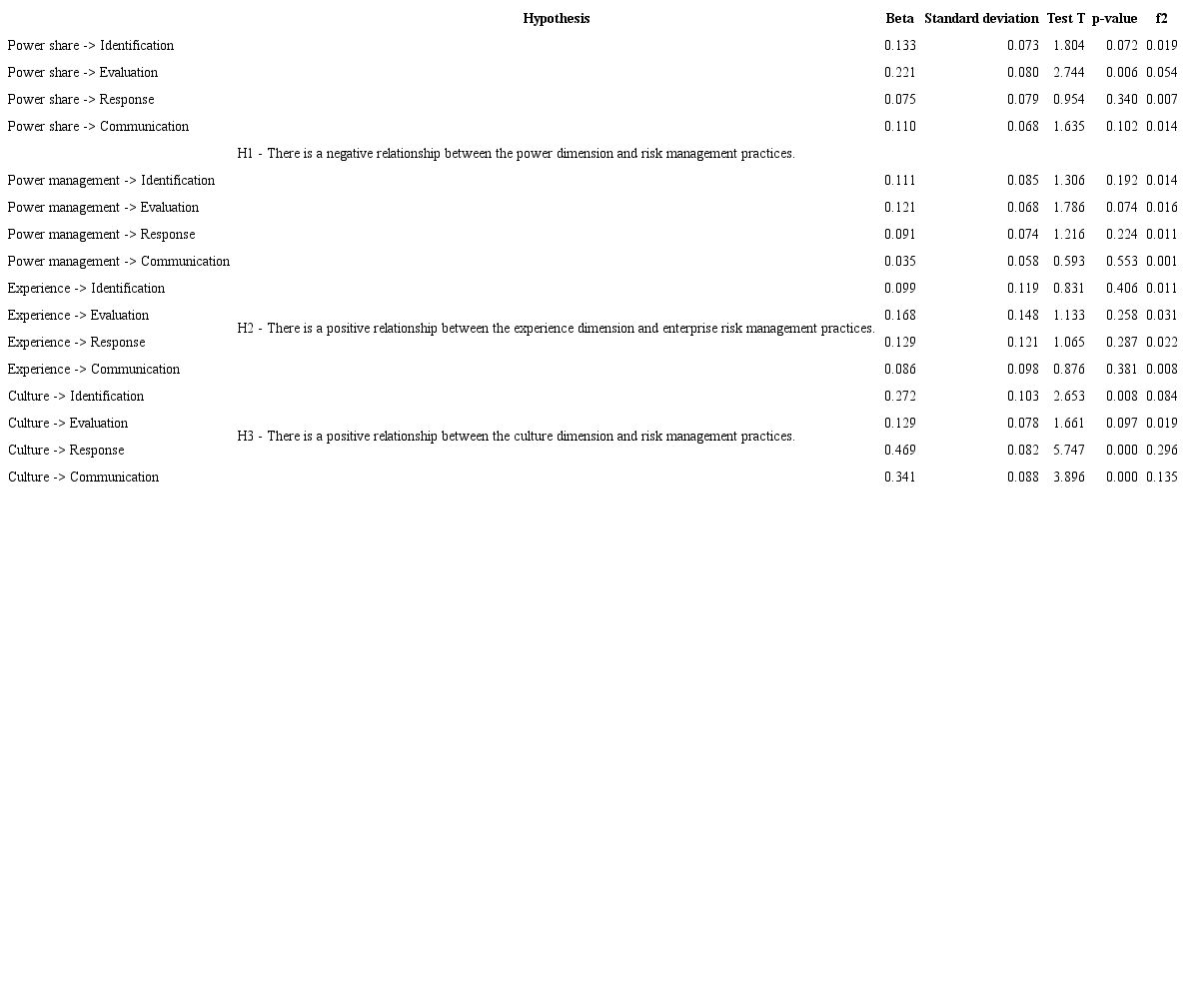 In summary, the evidences found at this stage of the research suggest that family involvement - in particular through shareholding control (power) - and the dissemination of family values and believes (culture) in the organization lead to, in some respects, a greater concern with the ERM process. It was not possible to confirm H1 because we found a positive relationship between power and ERM; however, while we did not find significance in all ERM variables, there was significance in the relationships between the power share variables, as well as between management power and risk assessment. We also did not confirm H2 since there was no relationship between experience and ERM. H3 was confirmed with a positive and significant relationship between culture and ERM.