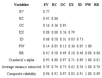 The validity of the measurement model was verified in three ways, namely: Cronbach’s alpha (AC), composite reliability (CR), and average variance extracted (AVE). Cronbach’s alpha performs the internal consistency analysis of the construct - values close to 1 are desirable, although values greater than 0.70 should be accepted (Hair et al., 2009). Composite reliability (CR) indicates the proportion of variance of the true scores of a construct in relation to the total variance of the calculated score, in which the desired values are those greater than 0.50. Average variance extracted (AVE) refers to the variance in the indicators that are explained by the latent construct, with the average of the factor loads being squared, and its desirable value is 0.50 or above (Hair et al., 2009).